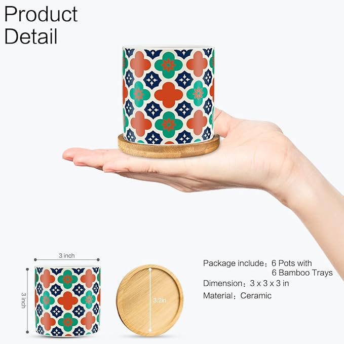 6 Pack Succulent Pots with Drainage Hole, 3 inch Ceramic Succulent Planter with Bamboo Tray, Bright Color Succulent Plant Pots for Cacti Succulent Soil Potting Mix Indoor/Outdoor