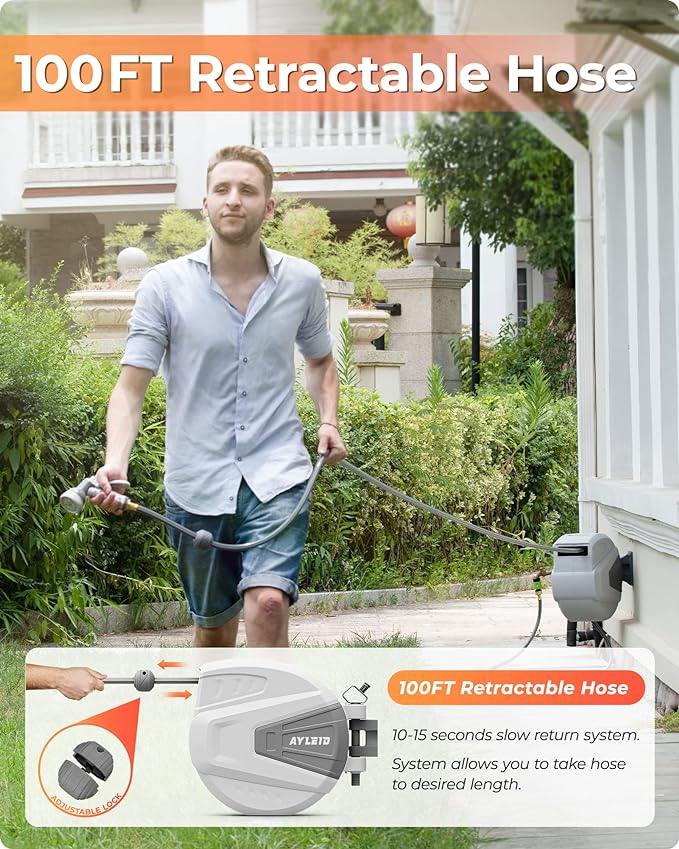 Ayleid Retractable Garden Hose Reel,1/2 in x 100 ft Wall Mounted Hose Reel, with 9- Function Sprayer Nozzle, Any Length Lock/Slow Return System/Wall Mounted/180°Swivel Bracket (Grey)