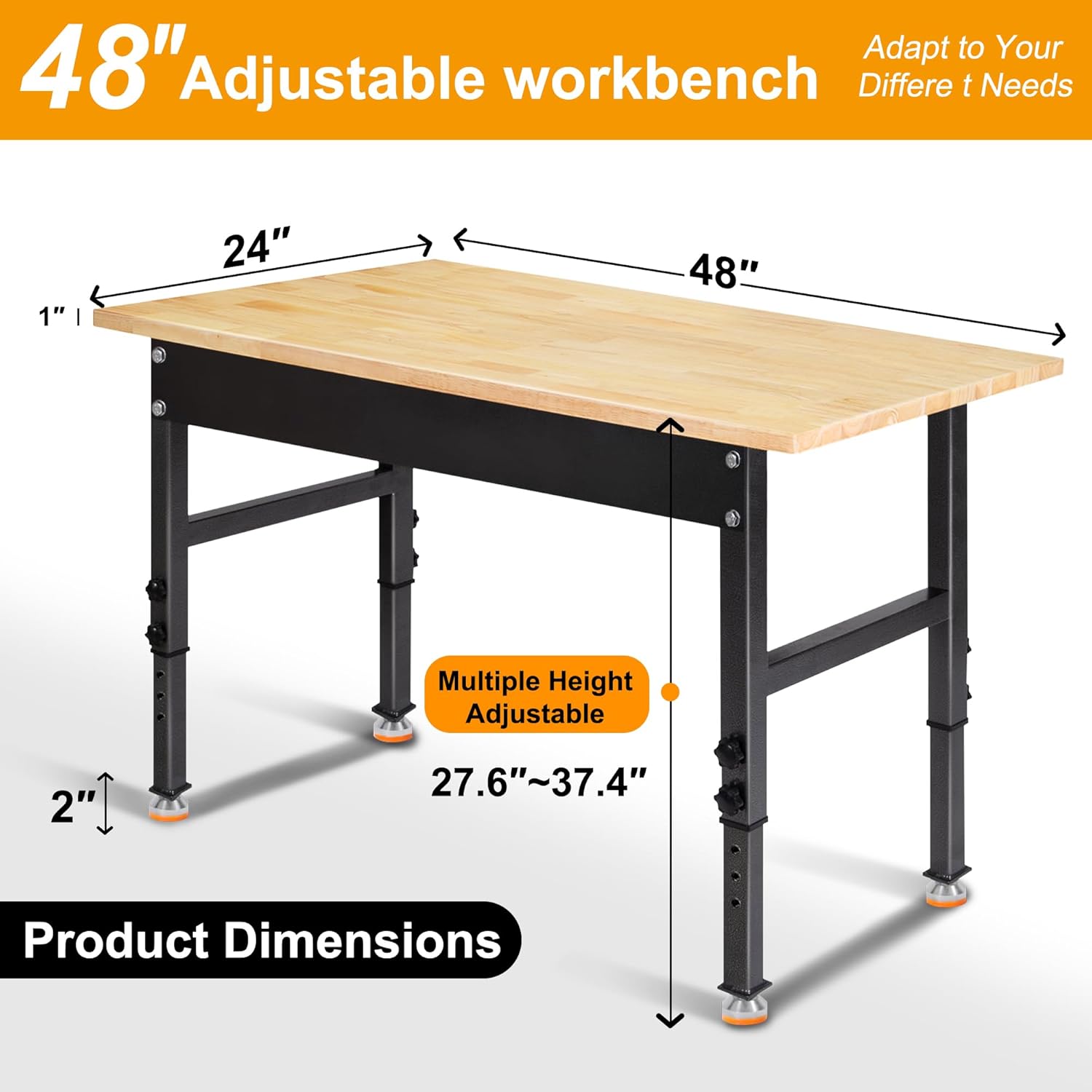 48" Adjustable Work Bench, Rubber Wood Top Workbench Heavy-Duty Work Table, 2000 LBS Load Capacity Hardwood Work Benches for Garage, Workshop, Home, Office, Easy Assembly