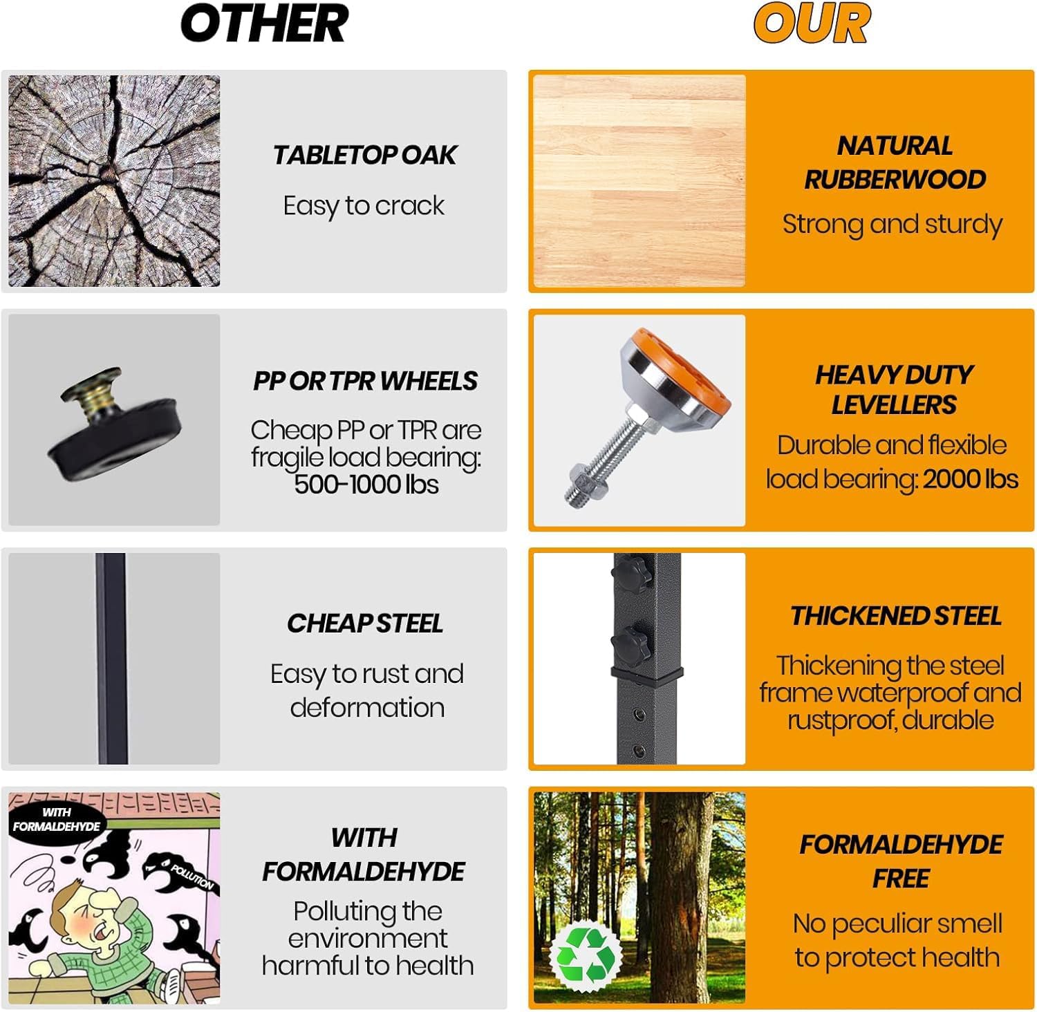 - 【Durable Material & Sturdy Base】Featuring 4 steel legs and 1.2" stronger rubber wood countertop, the stable and durable work bench ensures high weight capacity (up to 2000 lbs). Besides, it is free of burrs to prevent stabbing of the skin and it does not deform easily