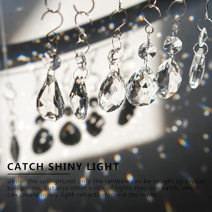 - 𝐏𝐀𝐂𝐊𝐀𝐆𝐄: 12 pcs various shape k9 Crystal Chandelier Prisms, each crystal prism include 1 pc prism pendant connected 1 pc 0.55”/14 mm glass bead with stainless jump rings