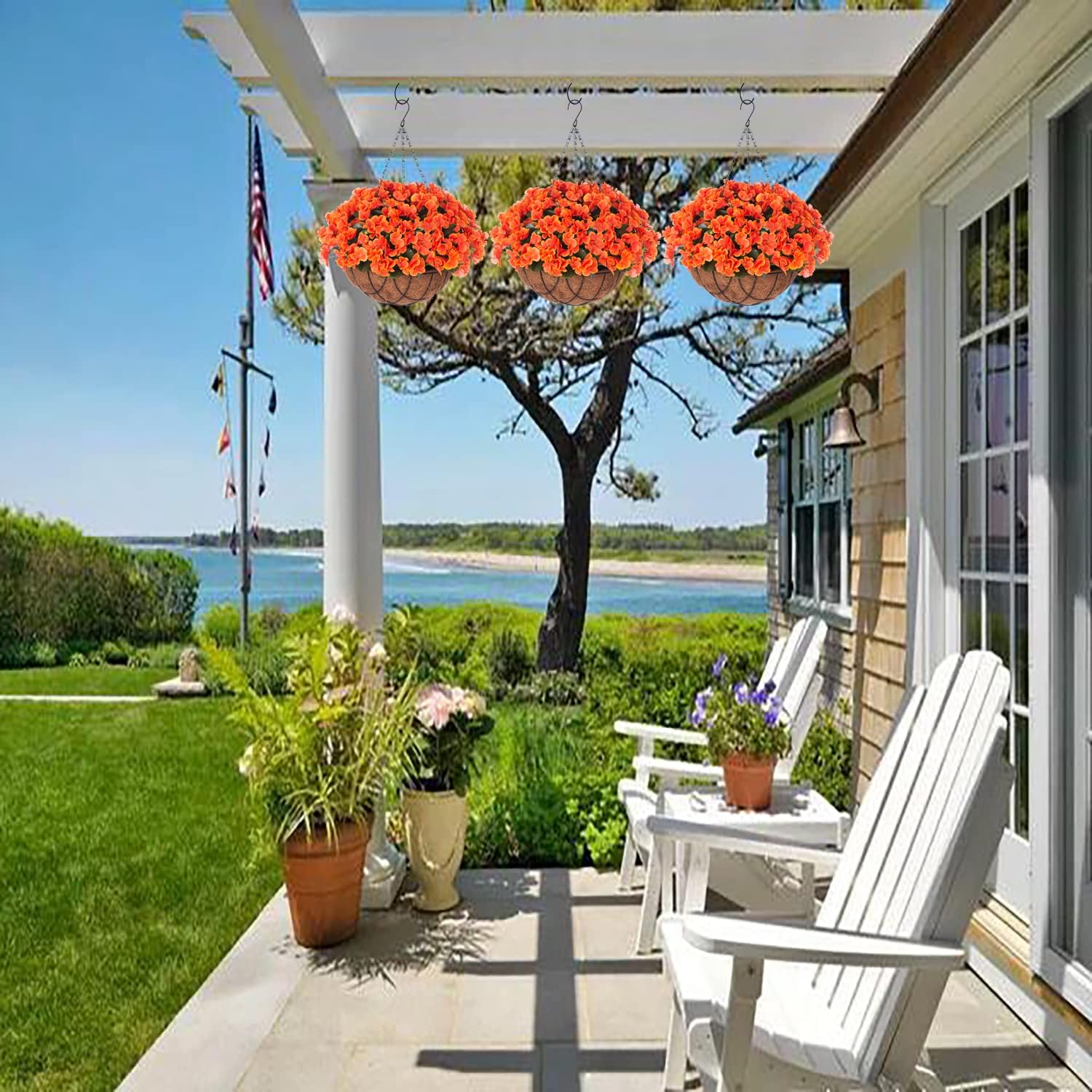 Fall Artificial Flowers with Hanging Basket for Outdoor Indoor, 4 Branches Fake Hydrangea Flowers in Coconut Lining Hanging Basket Home Courtyard Spring Summer Decor(Orange)