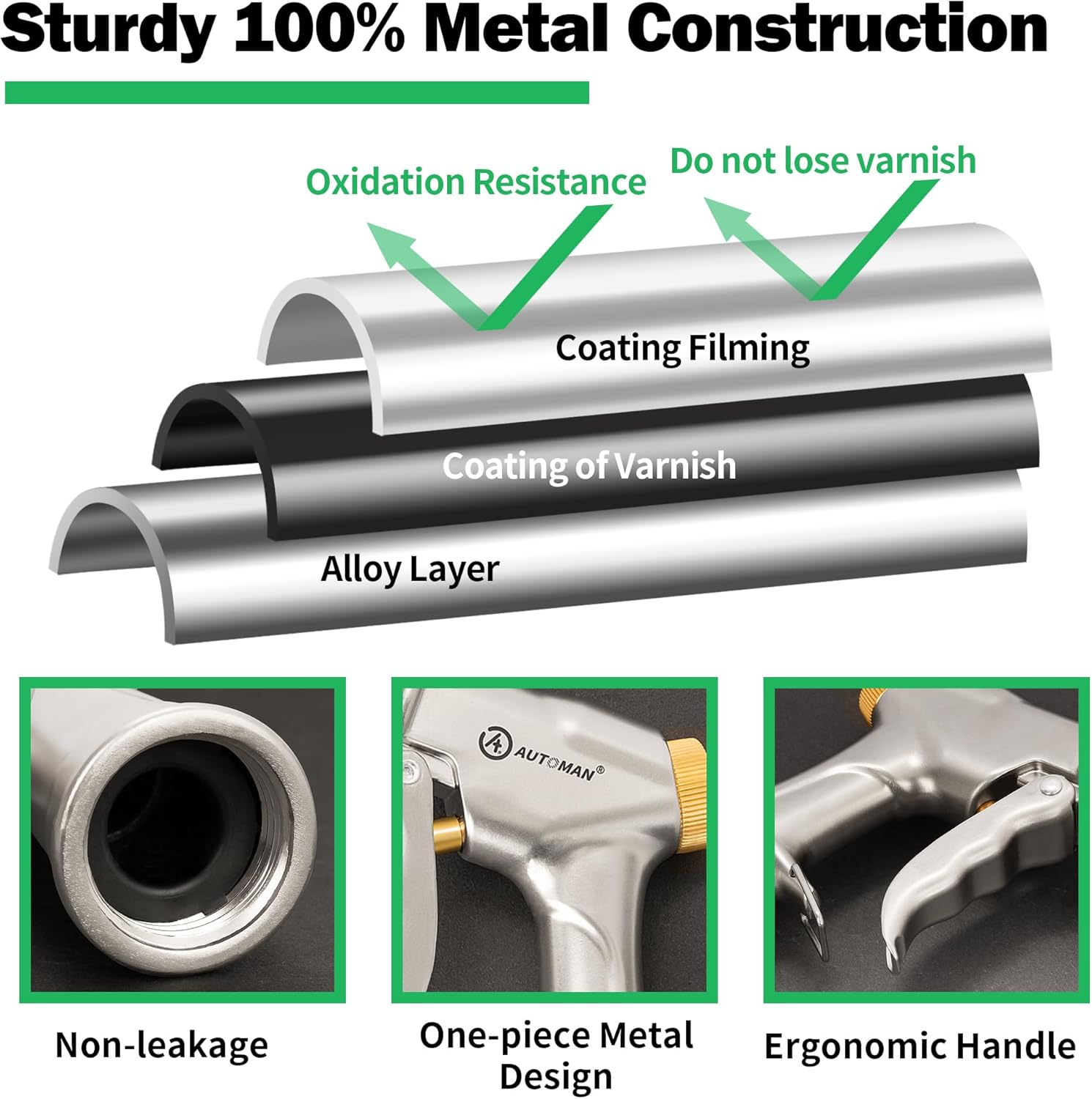 - 100% Metal Construction: The AUTOMAN garden hose nozzle is built using heavy duty metal. It better stands up to impacts and resists corrosion. Our metal nozzles are also coated a coating film that makes the model exposed to rain and UV for several months without noticing any breaking, failing, or even rusting. Our garden nozzle is 100% metal and high quality to prevent leaks, rusts and corrosions, much more than the plastic water nozzles.
