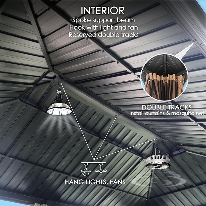 - ✅Two hooks have been specially crafted to accommodate fans or lights, enhancing the ambiance of your gazebo and making it a comfortable and inviting space.