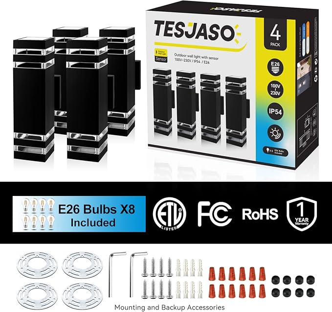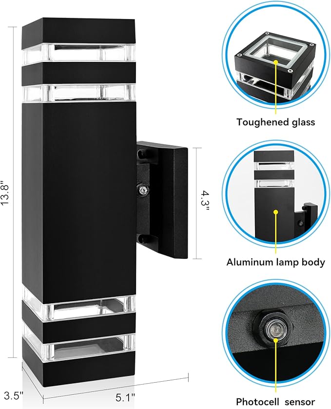 - Up and Down Double Lights: 2 pcs bright warm white E26 bulbs are included in each up down wall sconce. Outdoor lighting wall lamps are the great addition to your porch, garage, courtyard, garden, street, hallway or anywhere accent lighting need.