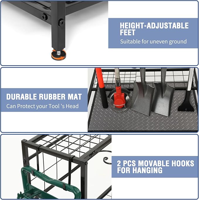 - INNOVATIVE GARAGE ORGANIZATION: G-hooks allows for electric tools like string trimmer and some tools with D-grip handle, height-adjustable feet suitable for uneven ground, durable rubber mat can protect your power garden tool 's head