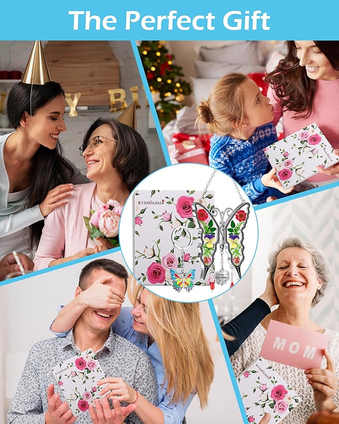 KY&BOSAM I Love You Mom Butterfly Suncatcher for Window Gift for Mom Pressed Flower Between Wings in Glass Metal Engraved Charm Gift for Women Mother's Day Valentine's Birthday Thanksgiving Christmas