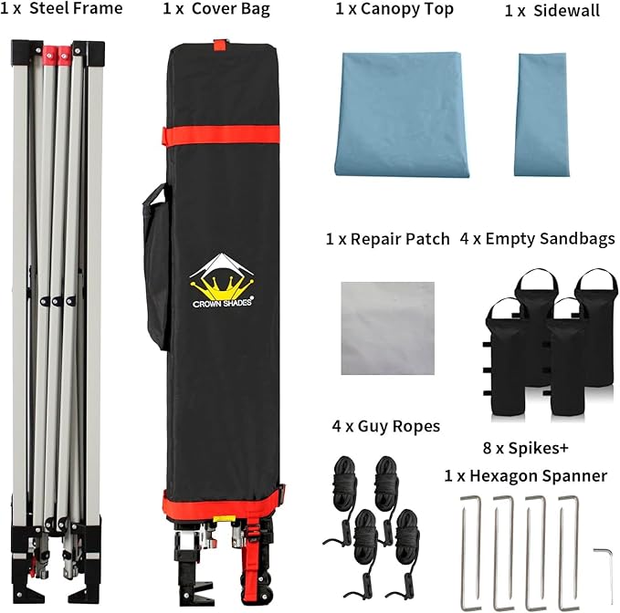 - STO’ N GO SYSTEM - Our lift-free system makes collapsing, storing, and transporting the 10x10 tent a breeze. The 10x10 tents can be stored with the fabric attached, with a specialized pocket for 4 sandbags, 8 stakes, and 4 guy ropes. Integrated wheels in the feet allow easy movement even when the instant shelter tent is set up, by simply lifting the side without wheels. This feature is especially useful for quick setup and takedown at locations like the patio or sports events