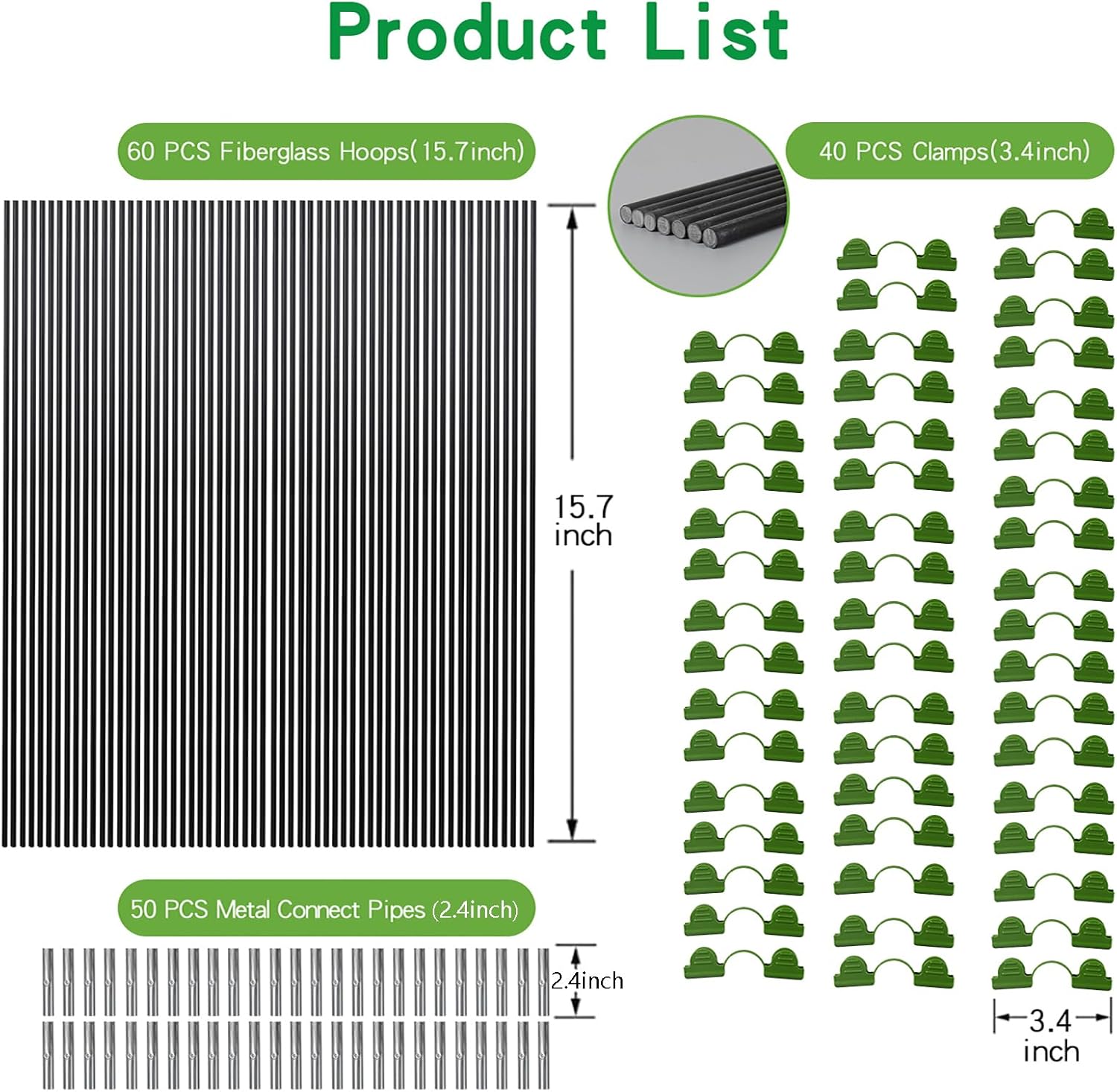 - Package: Include 60 pcs 16 Inch rust-free fiberglass greenhouse hoops, 50 pcs 2.4 inch metal connect pipes and 40 pcs 3.4 inch clips. You can combine with 4 or more hoops to DIY your own grow tunnel, clips can be used to fix the greenhouse covering. (Garden mesh net and plant covers are not Included)