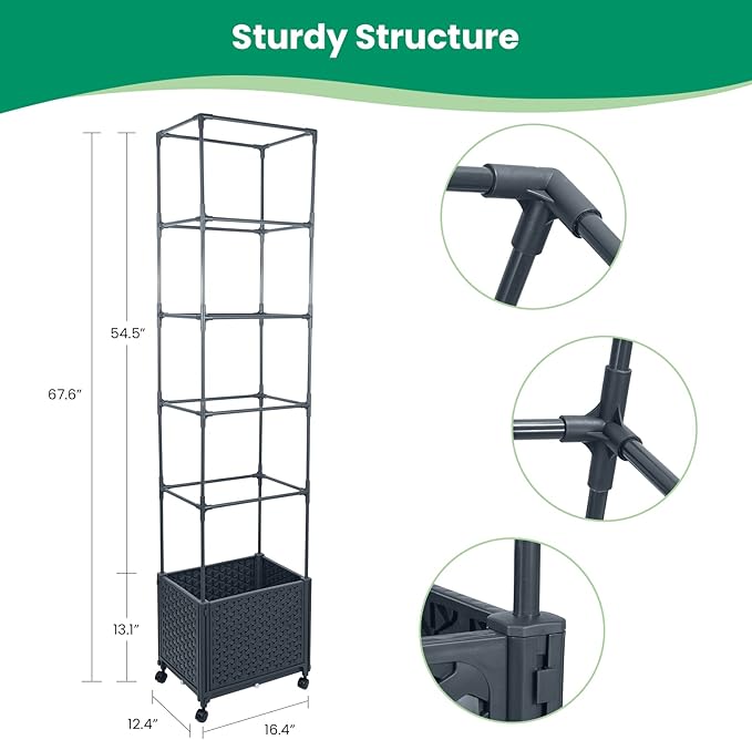 - Trellis frame provides strong support for heavy plants - eliminating the need for constant staking and tying. Having a strong plant support prevents 'snapping off' of heavy vines - increasing yield. Simply add additional risers and rings as your plant grows. This compact unit provides enough room for 1 large tomato plant with a few low-growing herbs or lettuces tucked in around its feet. The trellis provides support for vining flowers like sweet peas, or top-heavy flowers such as dahlias