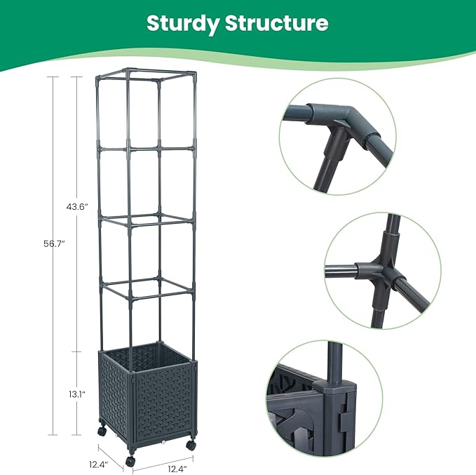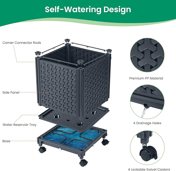 - 4 Optional Wheels -This raised garden bed includes 4 lockable swivel casters, each with brakes. With casters, you can effortlessly move your vertical garden bed around for watering or trimming or roll it out to the garden/yard for better photosynthesis or shading. To keep it still, just use locking pins