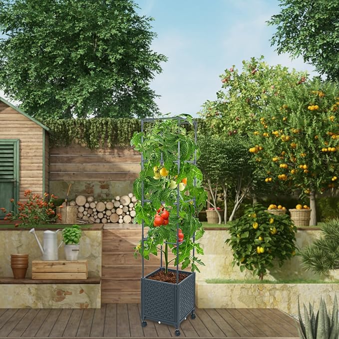 GREEN MOUNT Raised Garden Bed Planter Boxes with Trellis for Climbing Vegetables Plants, 56.7" Tomatoes Planters Outdoor Tomato Cage w/Wheels