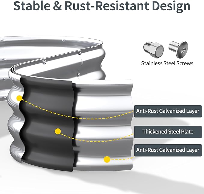 - Upgraded Galvanized Material:Raised garden beds outdoor is made of double-layer galvanized metal sheet with anti-rust coating to avoid rusting. The nuts and bolts are also galvanized. Super stability and rust resistance.