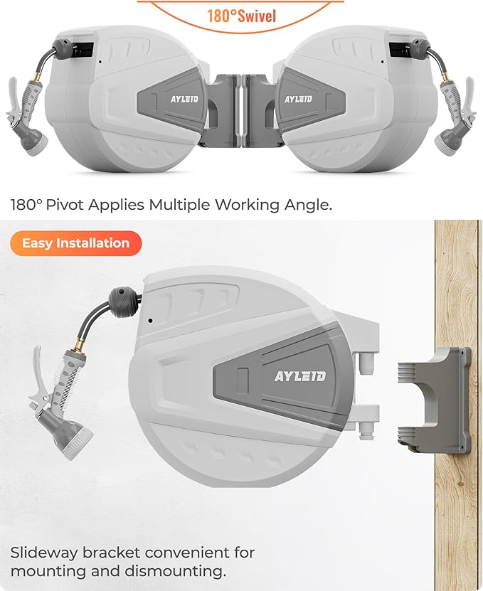Ayleid Retractable Garden Hose Reel,1/2 in x 130 ft Wall Mounted Hose Reel, with 9- Function Sprayer Nozzle, Any Length Lock/Slow Return System/Wall Mounted/180°Swivel Bracket (Grey)