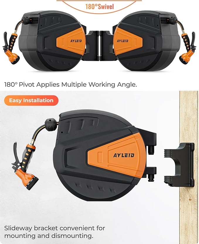 - 【Package included】1pc Ayleid Reel with 130FT Hose; 1pc Hose Nozzle; 1pc 9 Function Spray Nozzle; 1pc Wall mount; 4pcs bolts; 1pc User's Manual.