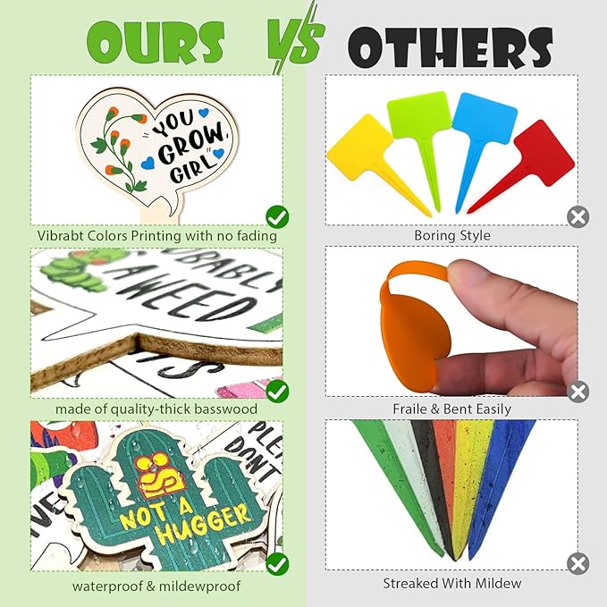 - 🌿Sturdy & Durable: The plant labels for outdoor garden waterproof are made of high-quality wood, which is sturdy and durable, with high-quality printing, not easy to fade, and can stand the test of time. The T-shaped garden marker design, the garden labels bottom is pointed, you can easily insert it into the flower pot. Compared with plastic plant stakes, it is more environmentally friendly, does not contain harmful substances, will not pollute the soil and harm plants.
