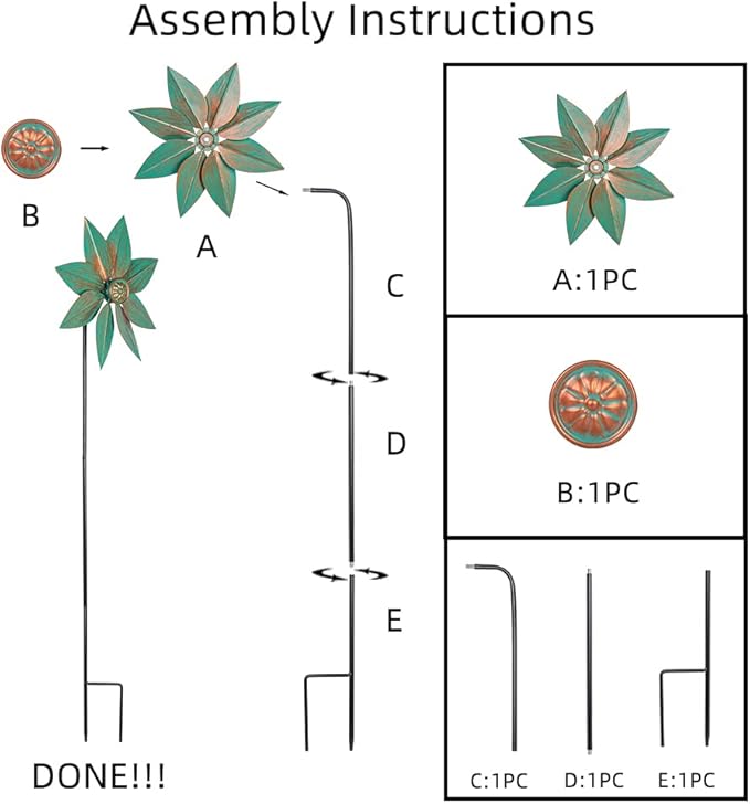 - [Easy to Assemble] DREAMYSOUL yard pinwheel spinners is easy to assemble. Tighten the parts piece by piece with our instructions, and then insert metal stake into soil or grass. Enjoy the beautiful visual experience in your garden.