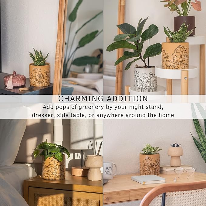 • Mushroom Planter with whimsical etched design all around. Fun and eclectic decoration sure to make a cottagecore statement. Holds small indoor plants, fresh flowers, and succulents