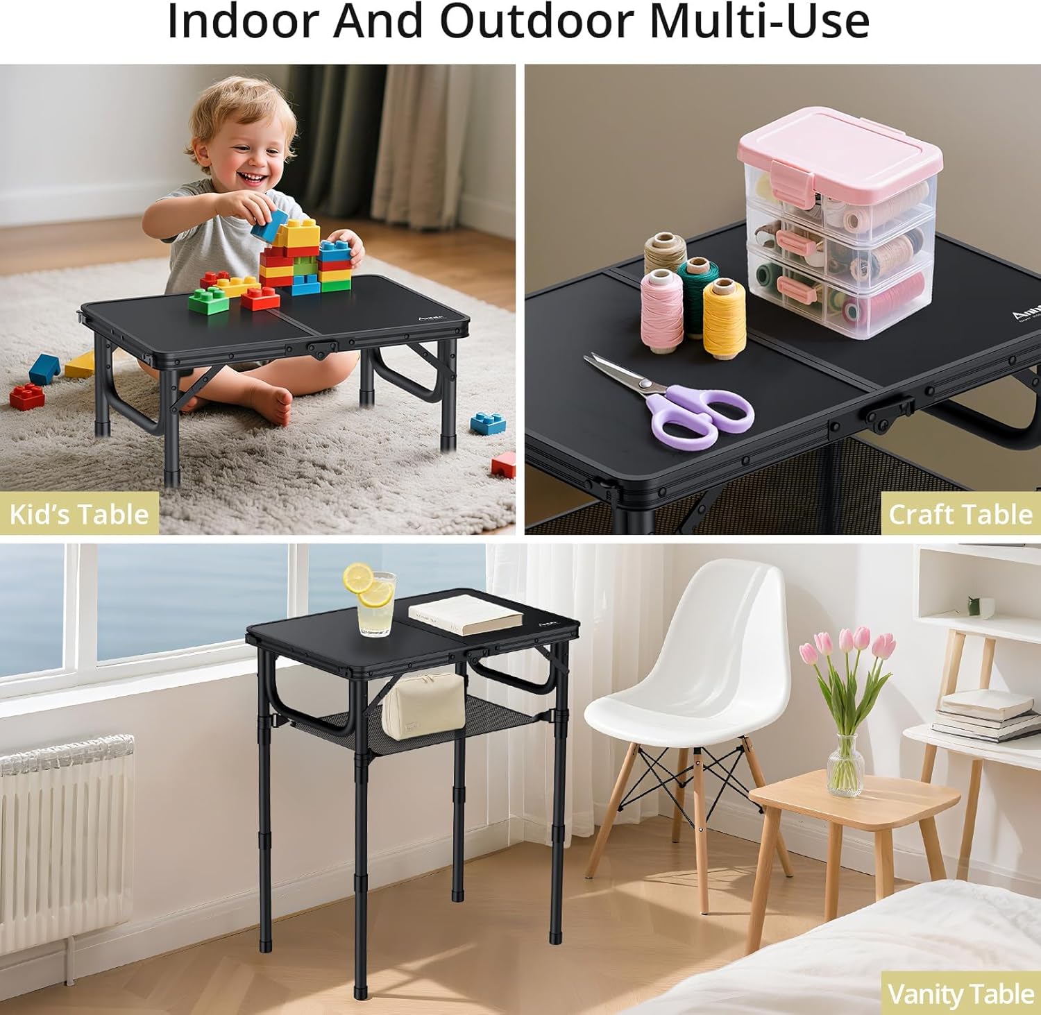 Folding Camping Table with Storage Net, Pure Black Aluminum 2ft Picnic Table 23.2" x 16" Outdoor Table Adjustable Height Max 27.5", Lightweight, Waterproof, Portable Handle for Travel Cooking