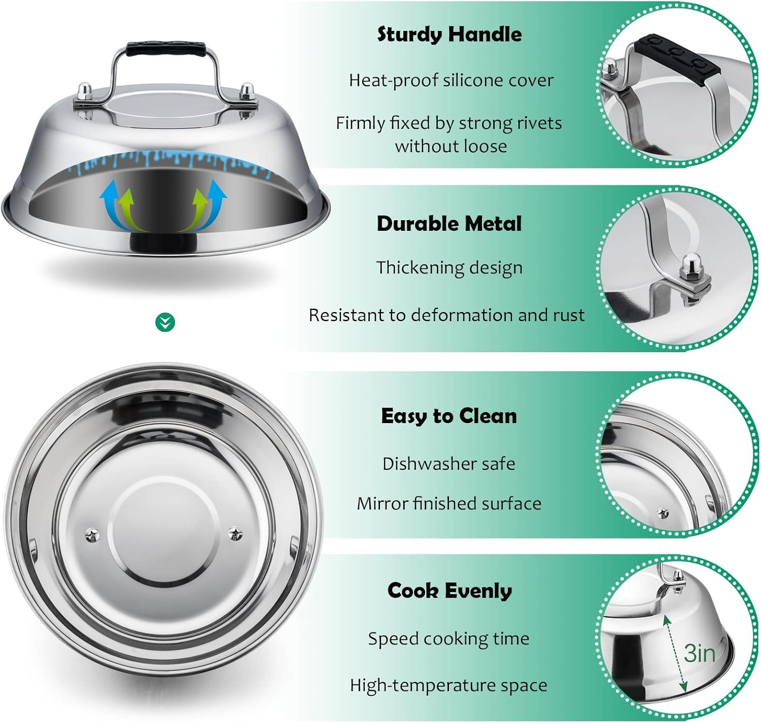 - Great auxiliary tools: 9in heavy duty melting dome is perfect for melting cheese and steaming vegetables, Create an oval-like heat-sealing space for speeding cooking time, 2 different colors squeeze bottles can distinguish sauce easily, Slanted scraper can reduce the food residue after cooking end to keep griddle clean, Plus 9 S-shape hooks for easy hanging in the kitchen or next to grill and convenient storing