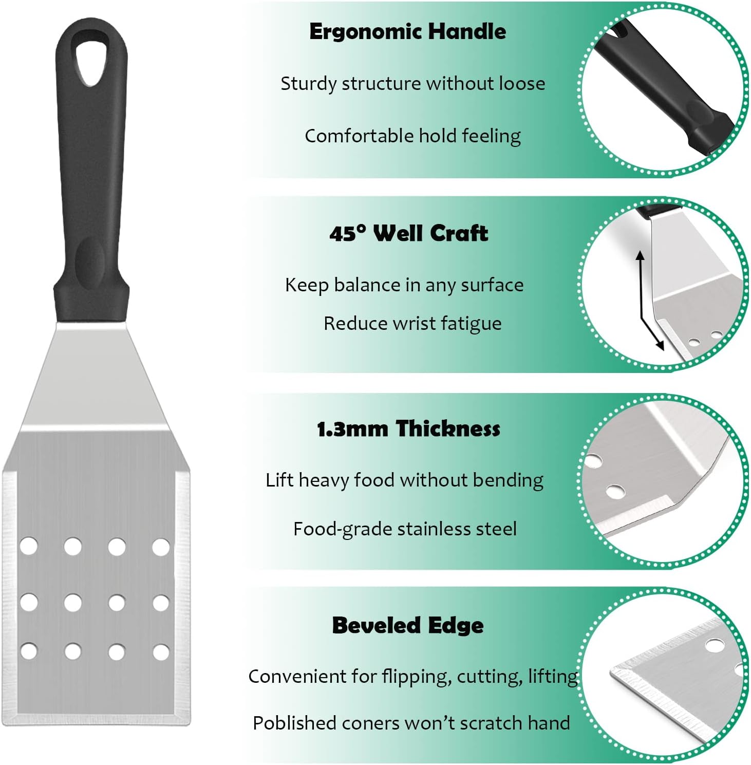 - Thoughtful details: 5inch long handle is suitable for most of a person’s size need, Frosted surface is easy to grip and comfortable to hold, Oval grooved for thumb can reduce wrist fatigue effectively, 45° angled structure between the handle and blade is perfect for grip and prevent handle gets hot from high temperature, Beveled edge with polished corners is convenient for easy lifting, turning, flipping, but won’t scratch your hand