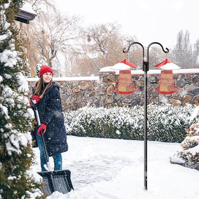 - Easy to Assemble & Use - Each metal bird feeder hanger rack includes 2 hook, 1 fork and 2 extenders. Anyone can complete the assembly for several seconds, just align the holes' positions and twist the poles together. It is easy to plug into the ground as well, just use your feet to push the shepherd's prongs into the ground. Our humming bird stand feeder keeper is effortlessly to disassemble, occupies a small space, and convenient for storage