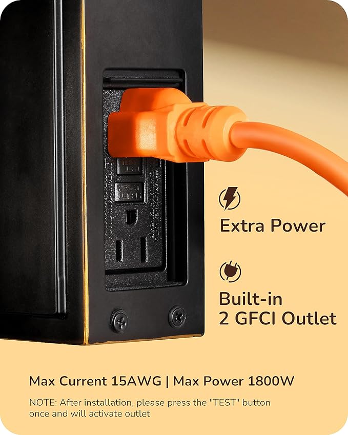 - [Bulit-in 2 GFCI Outlets] Our outdoor wall sconce bulit-in 2 GFCI outlets (Ground Fault Interrupter), add protection from power surges, short circuits and other electrical faults; suitable for two-prong and three-prong plugs, can be plugged into cameras, light strings, lawn mowers, drop leaf blowers, barbecue grills (Maximum: 15A 1800W)