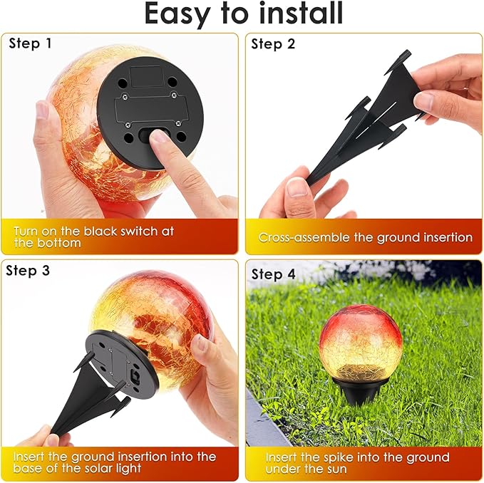 - IP65 Waterproof and Durably: Solar lawn lights decorative are fully enclosed by ABS and cracked glass. Durably construction and weather resistant feature of the solar ball lights outdoor. Our garden lights solar powered are made of IP65 waterproof upgrade and there will be no condensation, can be used in bad weather conditions such as rain, snow, ice, wind and so on