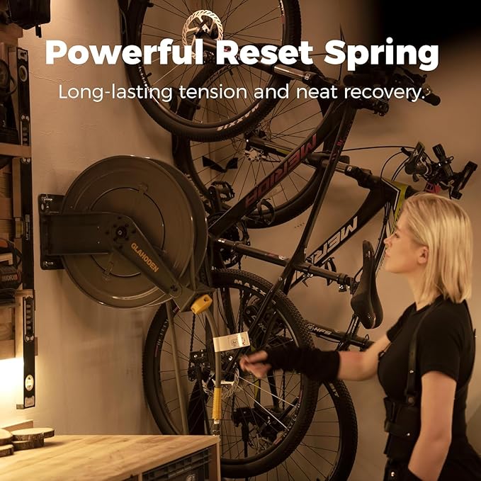 - Heavy Duty Double Arm All-steel Construction: GLAHODEN air compressor hose reel retractable is compact and virtually indestructible by using 0.04 in thickened steel and 0.15 in thick support arm. The high quality powder coated surface is extremely durable and always looks like new (weighs 34.99 lbs, please install on a sturdy surface).