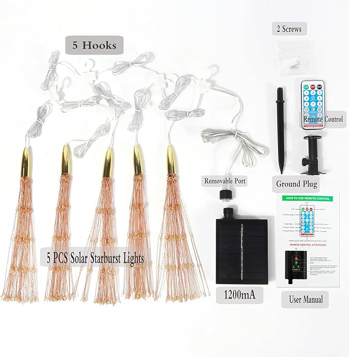 - 【SCOPE OF APPLICATION】Solar panel of the firework light is connected with the copper wire light string through the spiral port, can be disassembled and charged. Solar starburst lights can be used in indoor rooms, can decorate your Christmas tree, bedroom, wedding scene, cafe, window, can also be used as night light, outdoor decorative lights, corridor lights. Ideal for festive decorations, such as Christmas, with the effect of fireworks, creating a romantic atmosphere.