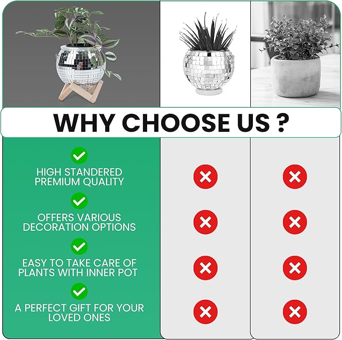 - TURN ANY SPACE INTO A DAZZLING OASIS WITH OUR DISCO BALL PLANTER. Elevate your décor and create a magical atmosphere with this one-of-a-kind disco ball planter. It's not just a pot; it's a conversation starter and a work of art. Whether in your living room, bedroom, or office, it's sure to turn heads and spark joy.