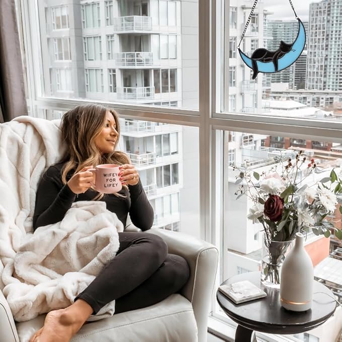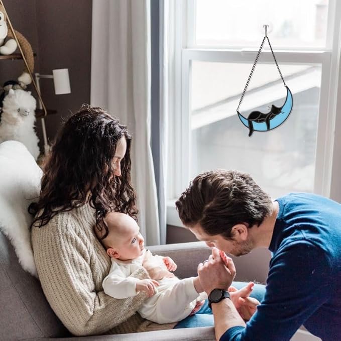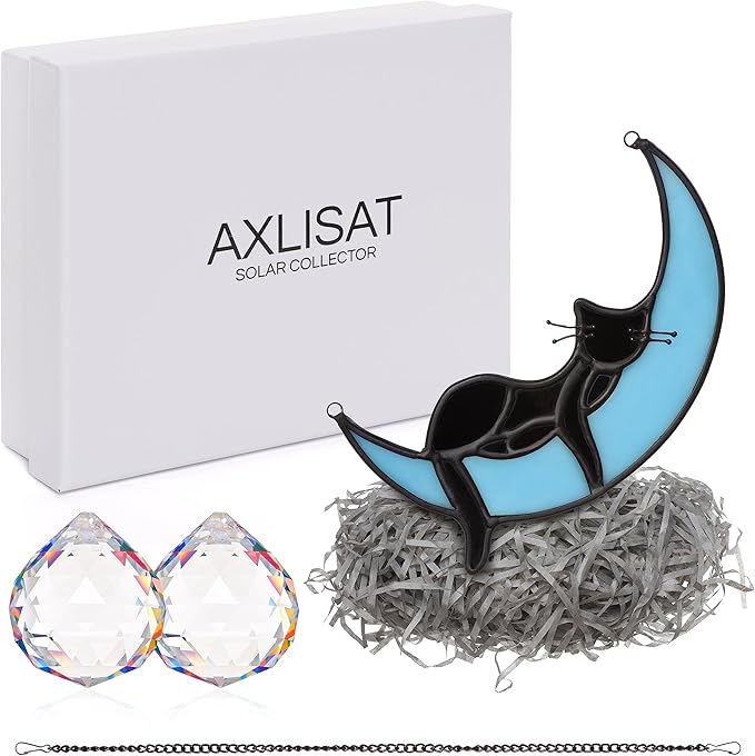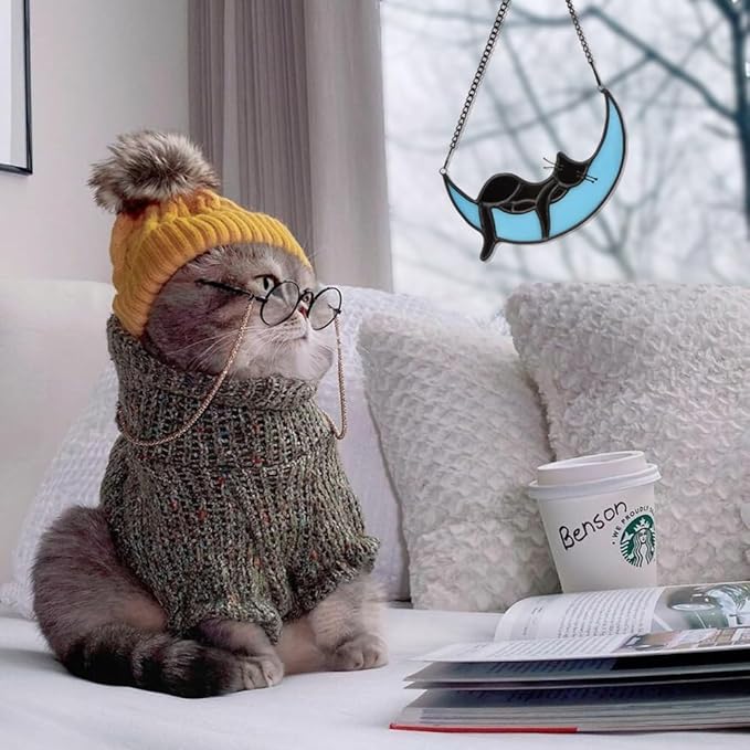 - STAINED GLASS MOON CAT MATERIAL:The Blue Moon Black Cat is made up of hand-cut colored glass plates, and every color is hand-painted and then welded together with copper foil. Because of its unique craftsmanship, every product is unique (Note:The product glass may have small bubbles due to the process)