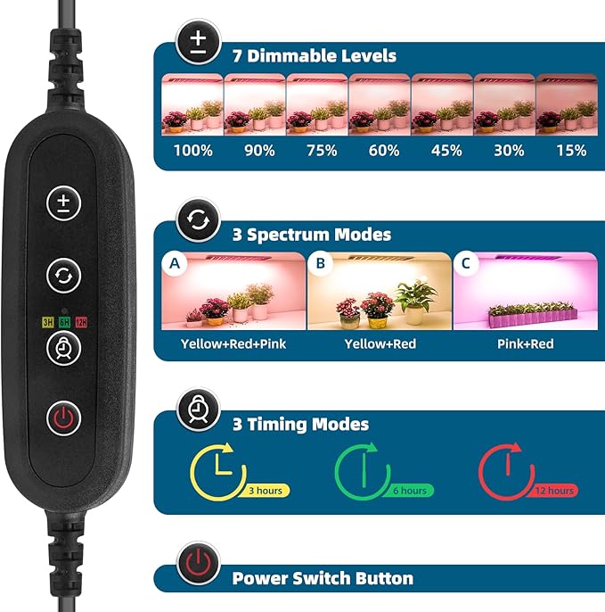 - Multiple Functions: Our plant growing lamp has 3 spectrum modes, 7 dimmable options (100%-90%-75%-60%-45%-30%-15%) and 3 cycle timing settings(3H/6H/12H), suitable for every cycle of plant growth, saving electricity while also ensuring the light needs of plant growth. And will take good care of your plants while you are at work or on vacation, easy and convenient