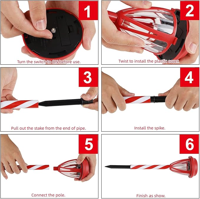 - EASY TO ASSEMBLE: Complete with detailed instructions. These solar Xmas garden lights can be done in a few minutes. Just connect the parts (pull out the stakes from the end of pipe) and stake into the soft ground where there has direct sunlight. In stormy weather, keep the solar lights indoors to avoid damaging the solar panels