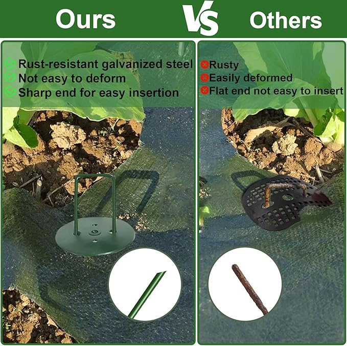 - EASY INSTALLATION: The green U shaped loop and sharp clean angled cut on the ends of our metal stakes with adjustable width easily penetrates weed barrier mat, plastic sheeting and heavy soil with ease. These pins hold securely in strong winds.