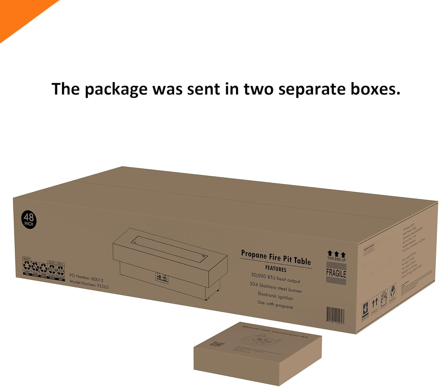 - Natural Gas Conversion Kit - Includes a natural gas conversion kit to convert the propane version to natural gas version, which will be shipped separately. We shipped the package in two separate boxes, It is possible that one package will arrive before the other.