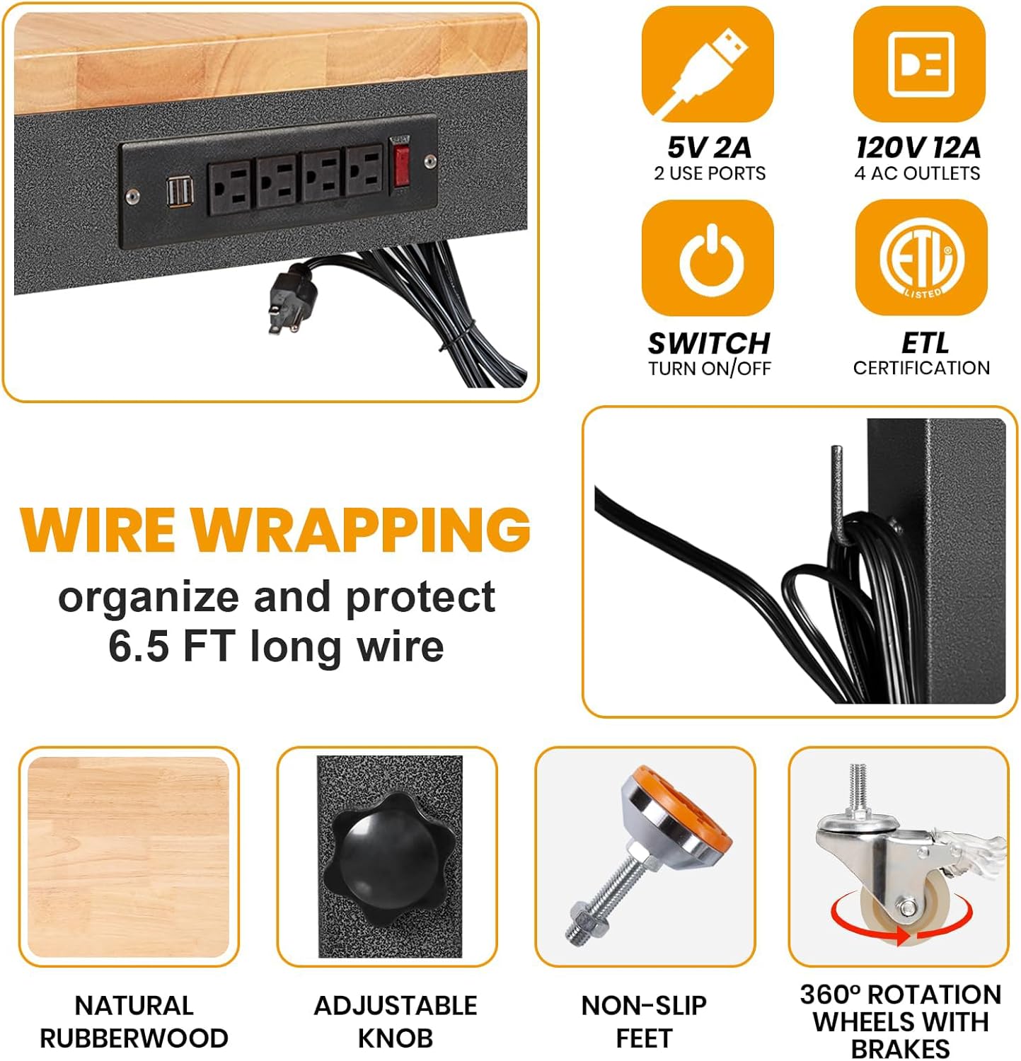 70'' Adjustable Workbench, Rubber Wood Top Work Bench Heavy-Duty Work Table with Socket, Wheels and Fixed Legs 2000 LBS Load Capacity Hardwood Sewing Table for Garage, Workshop, Home, Office