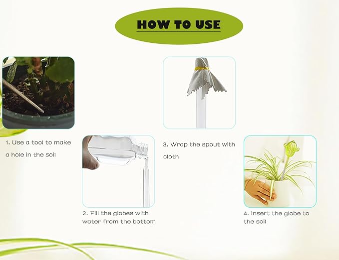 - Self-watering spikes: The plant watering bulbs automatically release water into the soil as needed, ensuring your plants stay properly hydrated even when you're away.