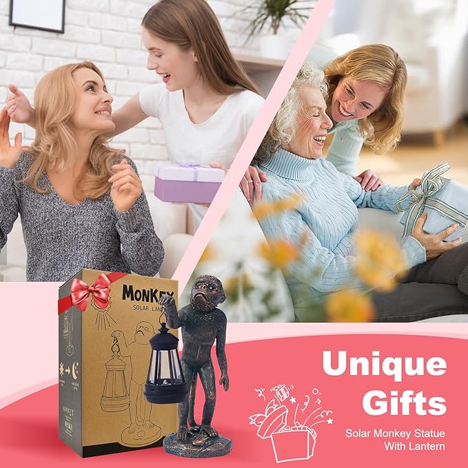 Garden Statue Monkey Figurine - Monkey Decor with Solar Powered Led Lights for Patio Lawn Balcony Yard - Ideal Gift for Women Moms Grandma Housewarming (Copper)