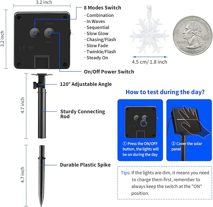- 【Auto On/Off Management】Featuring a built-in photosensitive component in the solar panel, our Christmas Snowflake lights automatically turn on at dusk and turn off at dawn. No manual operation is required, making it extremely convenient for lighting decor. If you have any questions about our products, please feel free to contact us.