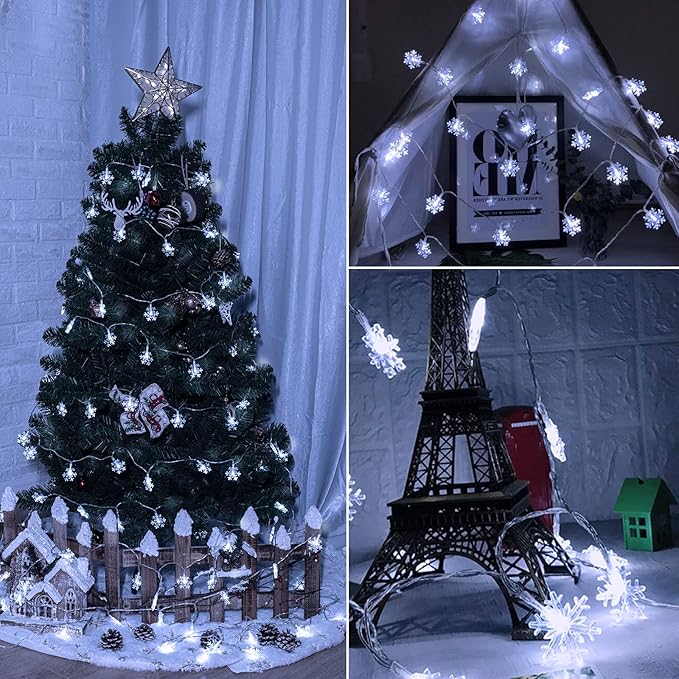 - 【Romantic Snowflake Christmas Lights】Transform any setting into a winter wonderland with our beautiful 39 ft long string of 100 LED warm white snowflake lights. Ideal for decorating bedrooms, courtyards, terraces, balconies, BBQ areas, tents, and more;