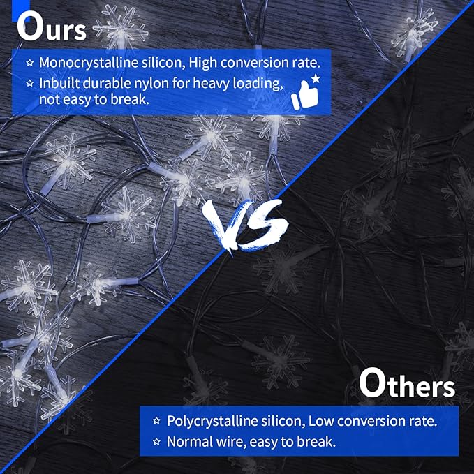 - 【Efficient Solar Snowflake String Lights】Our solar Christmas lights feature a 180-degree adjustable monocrystalline panel with a built-in 800mAh rechargeable battery, providing up to 8-10 hours of automatic operation every night without any additional electric cost;