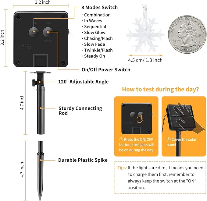 - 【Auto On/Off Management】There is a built in photosensitive component in the solar panel, the Christmas Snowflake lights will turn on at dusk and turn off at dawn automatically; No need for manual operation, so convenient for lighting decor; If you have any questions with our products, Please feel free to contact us.