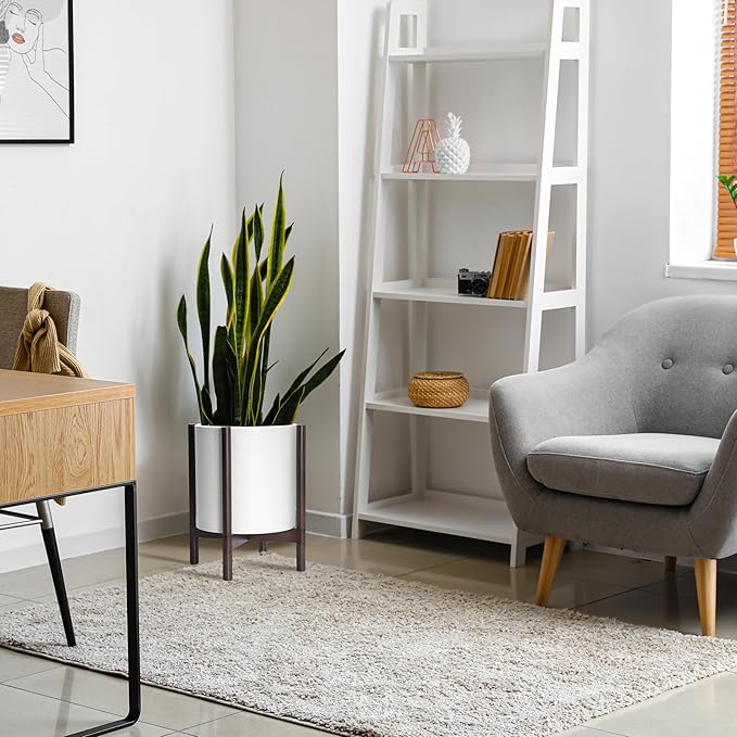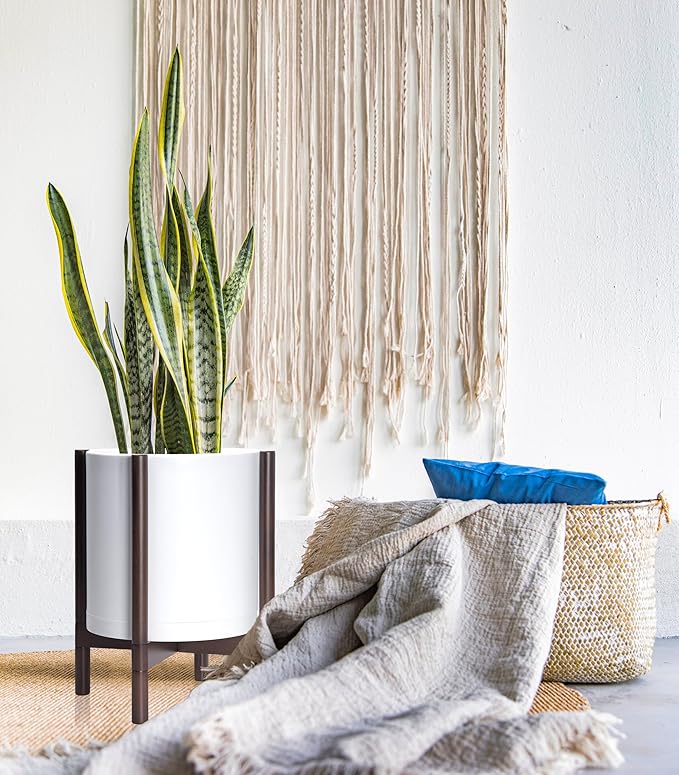 - A Complete Set: Minimalist plastic planter, combined with a sculptural, solid wood stand that match perfectly together and looks great in any home.