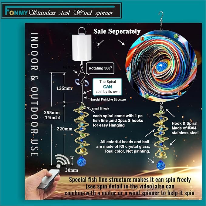 - 【PREMIUM CRYSTAL SUNCATCHER】The spiral with crystal is a special sun catcher rainbow maker, it’s Super Sparkly under sunshine. You can also add a motor(not include) to let the spiral to spin ,while spiral tail rotating (it can’t spin by itself.), the crystal ball seems to move up and down like floating and dancing in air, presents the magical visual illusion.