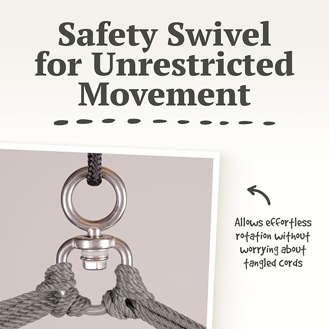 - SEAMLESS SWINGING EXPERIENCE: Experience the ultimate relaxation with our indoor or outdoor swing chair for adults, kids, or the whole family. This cotton hanging hammock chair has an integrated 360° safety swivel, allowing you to pivot effortlessly in any direction and provides a seamless swinging experience, perfect for indoor or outdoor lounging.