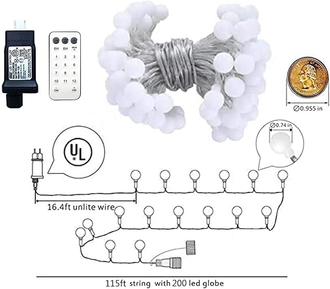 - Led Globe String Lights: Plug in 200 LED 115ft (98.6ft String Lights,16.4ft Lead Wire) Warm White Globe String Lights with Bulbs UL Listd, more durable,more energy saving,more environmental.