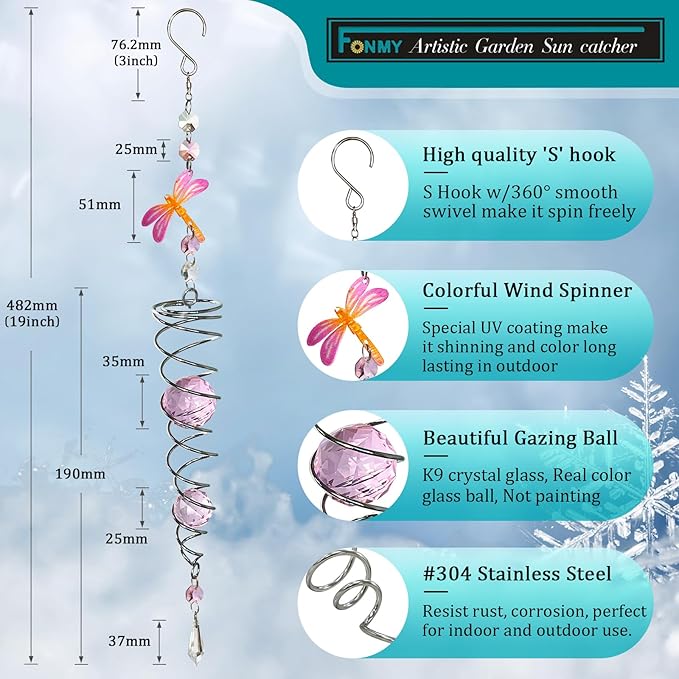 - 【HIGH QUALITY】:FONMYdragonfly Crystal wind spinner sun catcher is made of stainless steel wire with K9 crystal material, special double structure spiral tail w/ solid color K9 crystal glass ball,promised good weather resistant and amazing decoration. All FONMY crystal ball made of top crystal glass material with finely crafted, high clarity and cast beautiful rainbows, could turn the sun's rays into many rainbows.