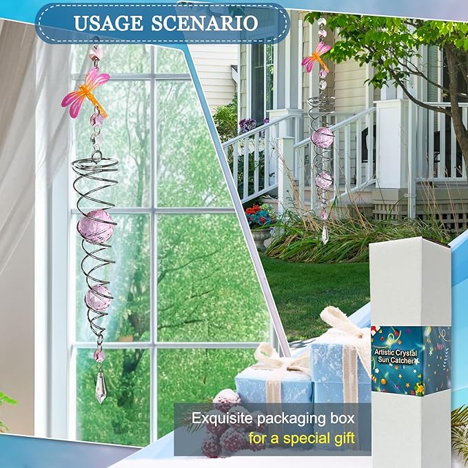 - 【PREMIUM CRYSTAL SUNCATCHER】The spiral with crystal is a special sun catcher rainbow maker, it’s Super Sparkly under sunshine. You can also add a motor(not include) to let the spiral to spin ,while spiral tail rotating (it can’t spin by itself.), the crystal ball seems to move up and down like floating and dancing in air, presents the magical visual illusion.
