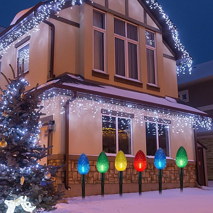 - Connectable Christmas Walkway Lights: Each set of 7ft multicolor C9 led Christmas lights outdoor 2.4 watts, can connect up to 180 sets of outdoor Christmas patio decorative walking path lights (maximum 432 watts). Plug in the Christmas pathway lights and enjoy, the jumbo colorful C9 christmas bulb pathway stakes lights make them stand out at night, bring more warm and charming atmosphere for the Christmas holiday.